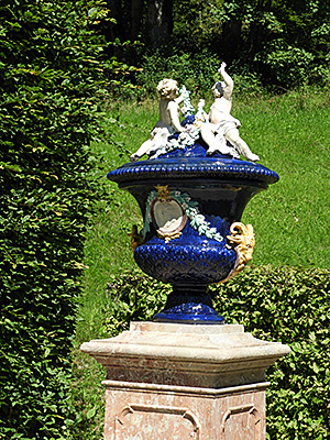 Oben: Blick vom Musikpavillon auf den Teich der Kaskade, Schloss, Terrassengärten und den Venustempel.