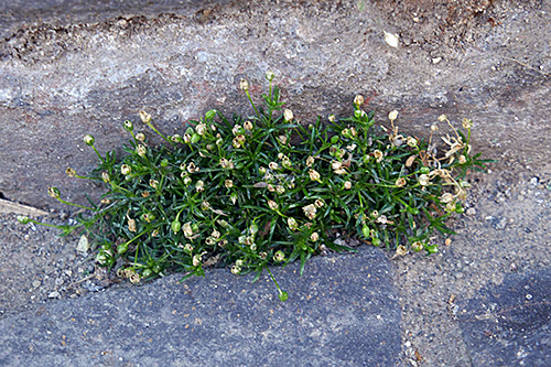 Dass Arten in Pflasterritzen alle so ähnlich aussehen, ist ein Beispiel für Konvergenz. Die extremen Standortbedingunfgen erfordern einfach kriechenden Wuchs, kleine Blätter und erlauben keine auffälligen Blüten. Deshalb sieht auch die mit Abstand häufigste Art solcher Stellen, der Sand-Vogelknöterich (Polygonum arenastrum ssp. calcatum) im Habitus genauso aus. Erst mit einer guten Lupe erkennt man an den Blüten und Früchten die Unterschiede, die eine Zuordnung zur richtigen Familie erlauben.