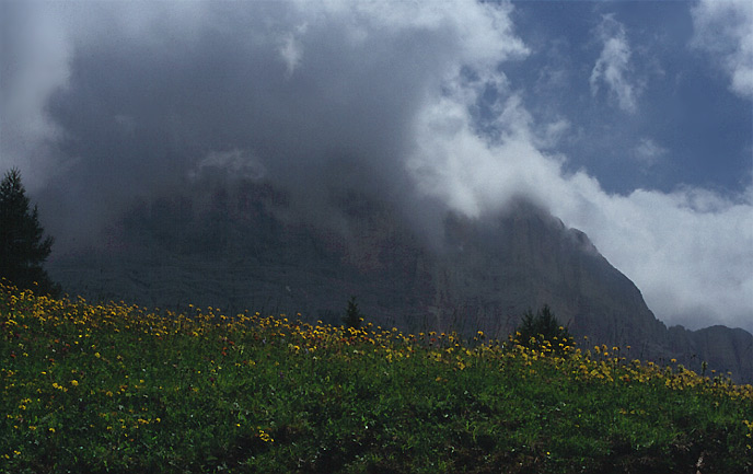 Das nächste Ziel war der Sas de Crosta. Der Weg führte zunächst über die Rit-Wiesen (oben). Das reiche Vorkommen von Arnika und Gewöhnlichem Kohlröschen auf Dolomituntergrund ist wohl der enorm sauren Rohhumusauflage des Gesteins zuzuschreiben.