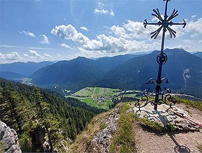 Vom Höhenrücken aus hatte man an einigen Aussichtspunkten, die zur Rast einluden, eine gute Sicht auf das breite Trogtal der Loisach und das Wettersteingebirge. Durch den Dunst konnte man die Zugspitze erahnen.